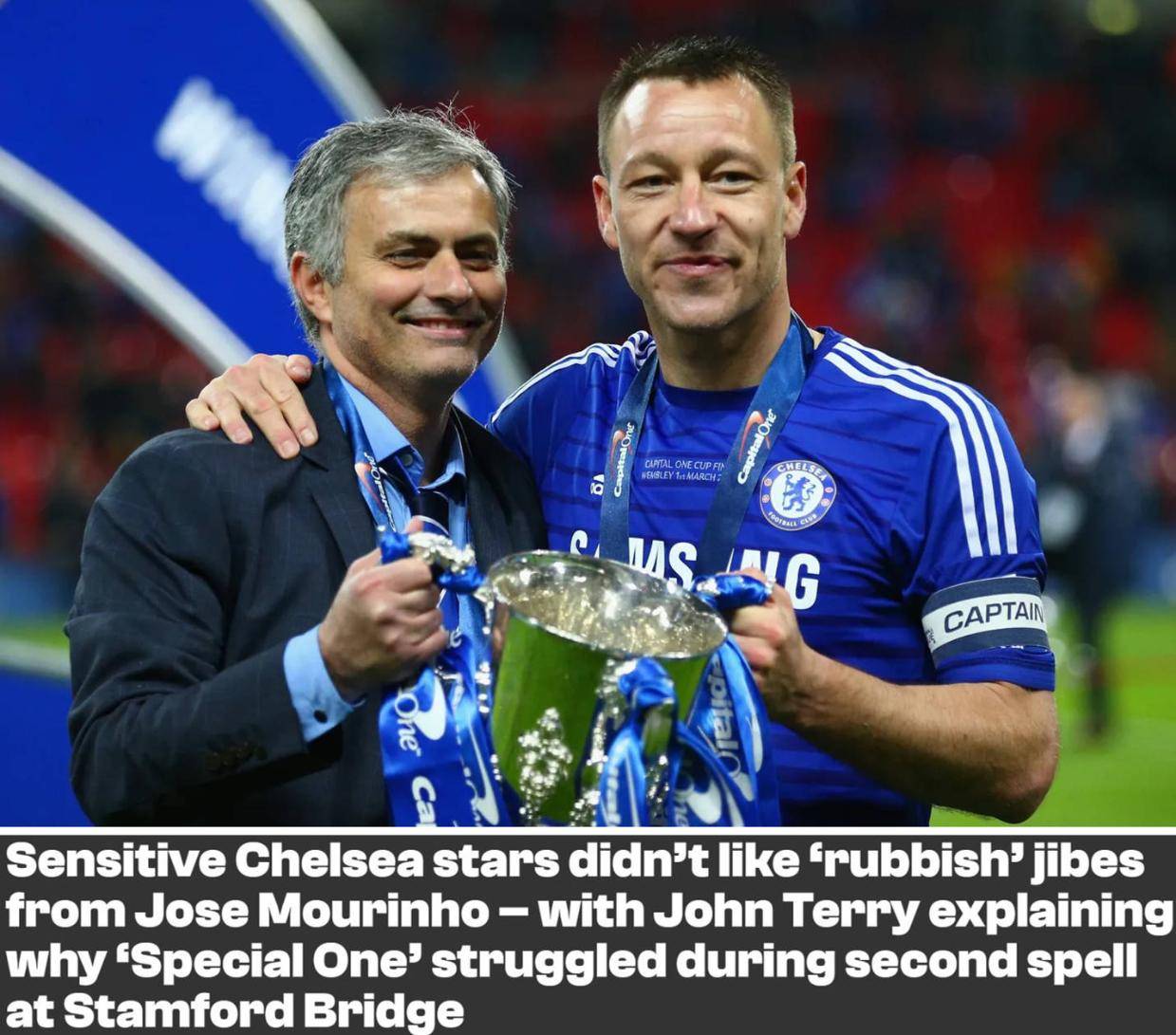当在接受采访时,特里给出了他对穆里尼奥在切尔西第二次离队的看法。特里说道:“很多人说他第二次时不一样了,我认为他回来后最大的不同是球员变了。在第一个时代,2004-05赛季,他可以对我、兰帕德、德罗巴或者队中的任何人说‘你们是垃圾,你们需要变得更好。’”