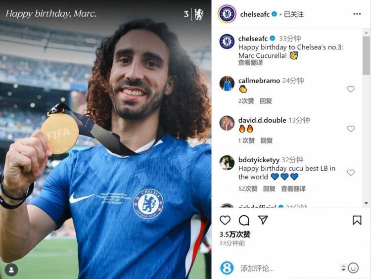 切尔西官方社媒晒出库库雷利亚展示世俱杯冠军奖牌的照片,配文:“祝切尔西3号球员库库雷利亚生日快乐!”